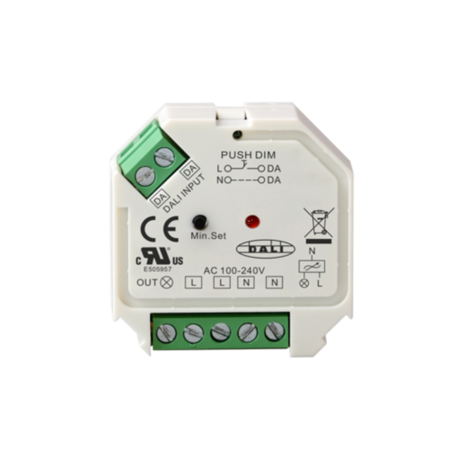 Fase-afsnijdingsdimmer met zowel DALI- als drukschakelaarinterface, voor naadloze integratie in jouw verlichtingssysteem.