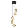 Vijf amberkleurige glazen pendels – Elke bol heeft een unieke vorm en geeft het licht op sfeervolle wijze door voor een warme uitstraling.